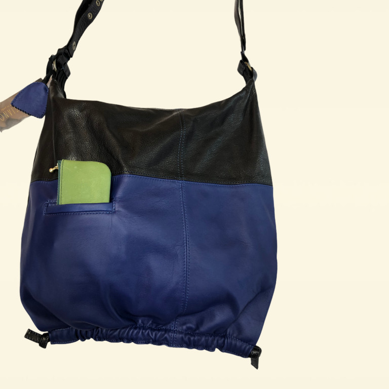 縦37×横40cm。牛革×羊革。長年愛され続けている商品です。黒と青のコンビもインパクトあり。