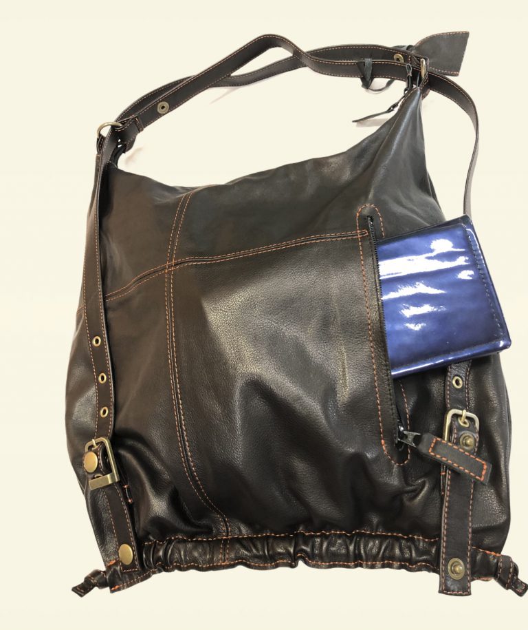 縦37×横40cm。ソフトな黒色の牛革なので、柔らかく軽い。折りたたんで、旅行鞄に入れていくのもありかも。