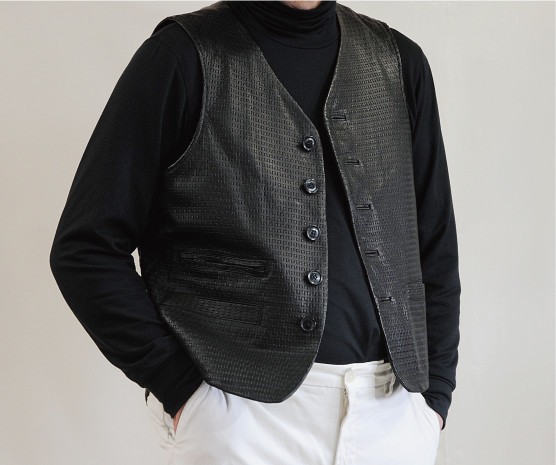 イタリアのタンナリー(なめし工場)のアルフレッドモッタ社の素材を前身頃に、後ろには、イタリア製のラム革を使用。 まるで編み込んだような表情が特徴の、しなやかで、着れば着るほど味が出る、大満足の一着間違いなし。 カジュアルにデニムと合わせても、少しカッチリとスラックスと合わせてもオールマイティーに、主役にも脇役にもなってくれるはず。